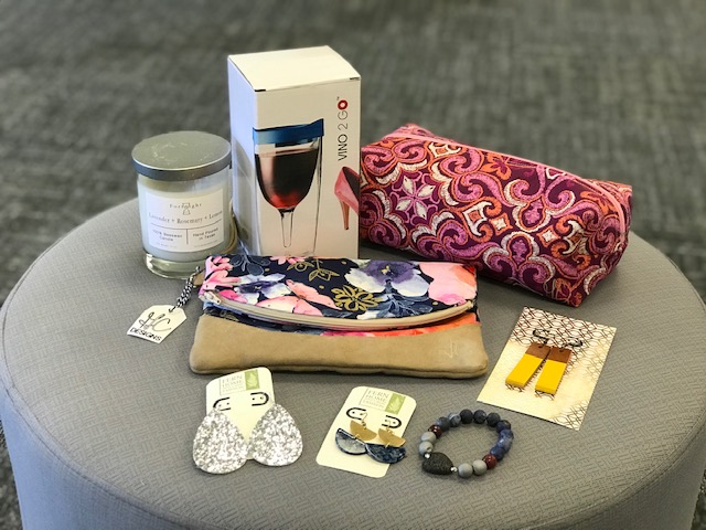 Local Finds: Fern Home & Fashion Jewelry, Handmade Clutch and Makeup Bag from GC Design Shop, Leather Earrings from Stamp & Hide Shop, candle from Fortnight and a wine to go cup!