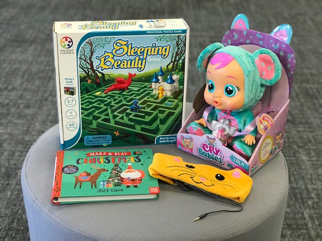Sleeping Beauty Pre-School Puzzle Game, Cry Baby, Cozy Kitty Headphones and a Christmas Craft book.