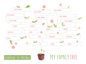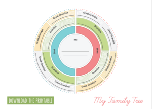 Take a modern spin on a family tree and try this circle family tree. This fun rendition of a typical tree makes it easy to fill out relative’s names up to great grandparents. Click HERE for the printout.