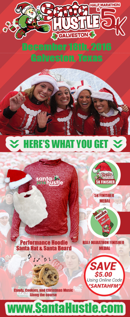 Save $5.00 on the Santa Hustle Galveston Half & 5K