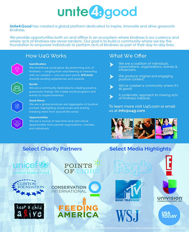 Unite4:Good (U4G) has created a global platform dedicated to inspire, innovate and drive grassroots kindness. Our goal is to build a community where we lay the foundation to empower individuals to perform acts of kindness as part of their day-to-day lives. In October 2015, we will launch our platform dedicated to providing positive content and opportunities to make a difference.