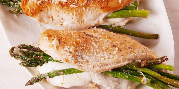 - On a clean work surface, cut a pocket into each chicken breast, then stuff each with mozzarella, and asparagus. Season chicken all over with oregano, salt, and pepper. Secure with toothpicks.