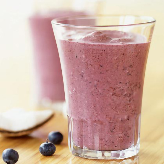 In a blender, combine 1 cup pineapple sherbet or sorbet, 1 cup frozen blueberries, 3/4 cup canned reduced-fat coconut milk, and 1/4 cup sweetened shredded coconut. Whirl until smooth and pour into a chilled tall glass (at least 16 oz.).