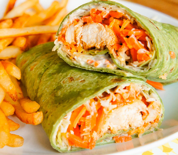 - Arrange cooked chicken pieces down the center of each tortilla. Wrap tightly, cut in half, and serve.