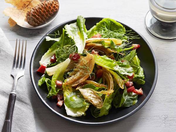 - In a large bowl, place the salad greens, crumbled pancetta, and caramelized fennel. Toss the salad with the Red Wine Vinaigrette and serve immediately.