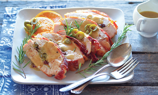 - When gravy is done, remove from heat and drizzle over sliced turkey breast. Garnish with remaining green olives and orange slices. Serve warm.