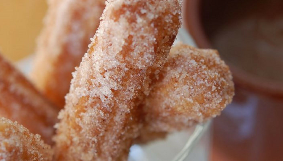 - Combine 1/2 cup sugar and cinnamon. Roll drained churros in cinnamon and sugar mixture.