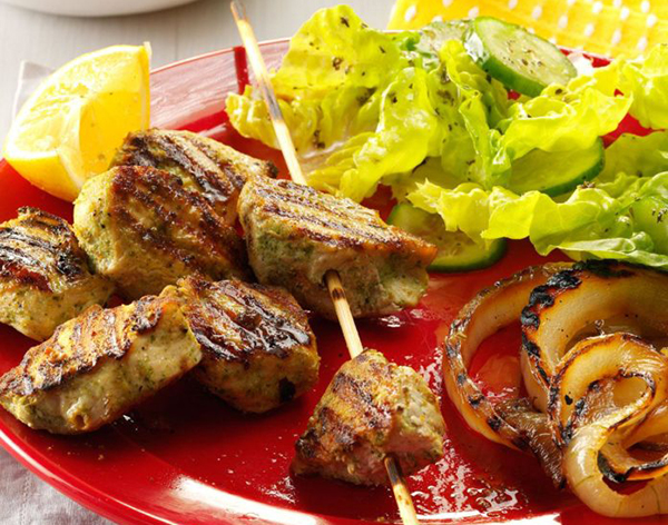 - Remove chicken from marinade; discard marinade. Thread chicken onto six metal or soaked wooden skewers. Grill, covered, over medium heat or broil 4 in. from heat 10-12 minutes or until chicken is no longer pink, turning occasionally and brushing with remaining oil during the last 4 minutes. Serve with grilled onions and lemon wedges.