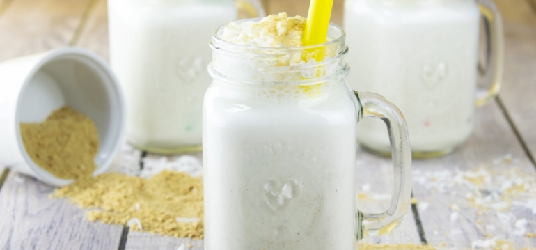 - In blender mix ice cream, cream of coconut, flaked coconut and graham cracker on high until smooth. Pour into glass. Top with whipped cream and graham cracker crumbs.