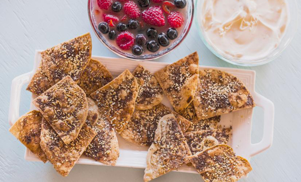 - In a bowl, toss the chips with the cinnamon and sugar, spreading the sugar evenly. Next, stack or mound the nachos on a large plate or serving dish. Top with the chocolate and bake until the chocolate is melted, 8 to 10 minutes. Remove from the oven and serve with Creme Fraiche and Warm Berry Salsa.