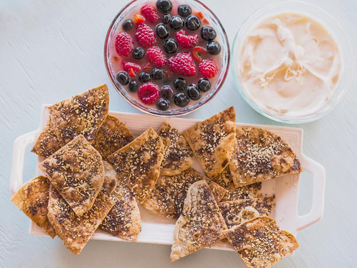 - In a bowl, toss the chips with the cinnamon and sugar, spreading the sugar evenly. Next, stack or mound the nachos on a large plate or serving dish. Top with the chocolate and bake until the chocolate is melted, 8 to 10 minutes. Remove from the oven and serve with Creme Fraiche and Warm Berry Salsa.