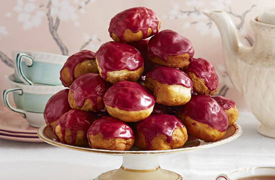 - Cook blueberries, rooibos, and 1/2 cup water in a small saucepan, pressing berries with a potato masher to mash, until syrupy, 8 to 10 minutes. Strain through a wire-mesh strainer lined with cheesecloth; discard tea. Add confectioner’s sugar and whisk until smooth. Dip tops of donut holes in glaze.