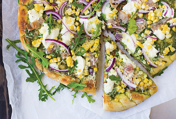 - Carefully flip dough over using peel or tongs. Remove crust from grill to add toppings. Spread Arugula Pesto over dough. Top with ricotta, ham, corn kernels, onion and Parmesan. Return pizza to grill, cover and cook until toppings are heated through and bottom of crust is crispy, 5-7 minutes.