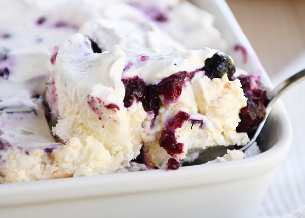 - To assemble, in a trifle dish, a large glass bowl or a 9X13-inch (or slightly smaller) dish, spread half of the angel food cake mixture. Top with half of the blueberries, dolloping across the top, and then spread half of the sweetened whipped cream on top. Repeat the layers. The layers don’t have to be perfect. It’s going to be a little haphazard and messy. Don’t stress.