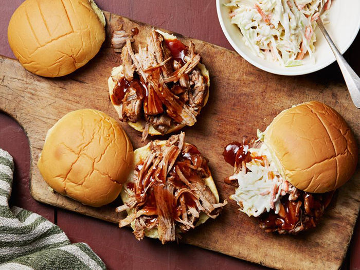 - Add 3 cups of the reduced cooking liquid to the chunked pork and season with salt and vinegar to taste. Serve in hamburger buns with barbecue sauce and coleslaw.