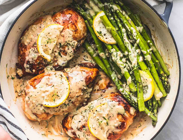 **For extra creamy sauce: Reducing the sauce down further (simmering longer until thickened) before adding asparagus and returning chicken to the pan will result in a thicker, creamier sauce. You can also whisk 2 teaspoons of corn starch into 1 tablespoon of chicken broth and stir this into the simmering sauce for an even thicker, ultra-creamy lemon pan sauce.
