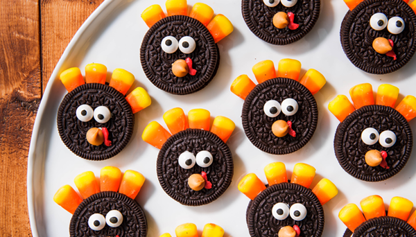 - Pipe a red line beside the beak to create a gobbler. Create feathers by stuffing four candy corns into the filling of the Oreo, point side down.Ā