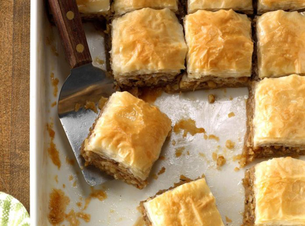 - Sprinkle 1/2 cup nut mixture in pan; drizzle with 2 tablespoons honey. Add two more phyllo sheets, brushing with butter; sprinkle another 1/2 cup nut mixture and 2 tablespoons honey over phyllo. Repeat layers six times. Top with remaining phyllo sheets, brushing every other one with butter.
