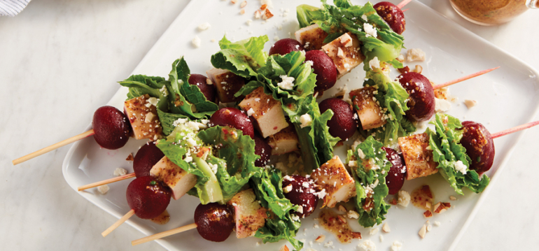 - Slice cooled chicken into 1-inch pieces. Onto each skewer, thread one beet, one piece of chicken and 4-5 pieces of lettuce; repeat two times for each skewer, adding one beet at ends. Repeat to make eight skewers. Place skewers on large serving platter.