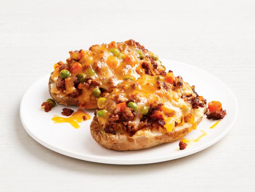 • Preheat the broiler. Halve the potatoes lengthwise and fluff the flesh with a fork; top each potato half with 1/2 tablespoon butter and season with salt and pepper. Place on a baking sheet. Divide the meat mixture among the potato halves, then top with the cheese. Broil until melted, about 2 minutes.