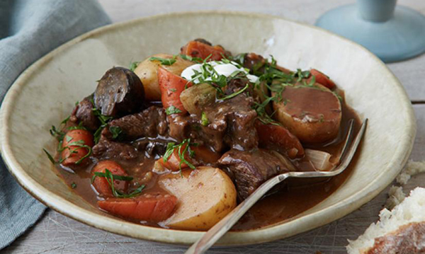 - Toss the beef with the paprika, 1 1/2 teaspoons salt and 1/2 teaspoon pepper. Coat in flour and shake off any excess. Heat 2 tablespoons of the oil in a large nonstick skillet over medium-high heat. Add the beef and cook undisturbed until it begins to brown, about 3 minutes. Continue to cook, turning the beef as needed, until mostly browned, about 3 minutes more. Remove the skillet from the heat and transfer the beef to the insert of a 6-quart slow cooker; add the potatoes, mushrooms, carrots and onions and stir to combine.
