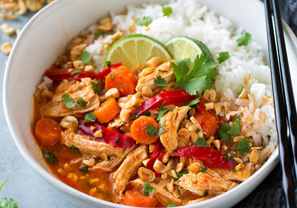 - Stir peanut butter, lime juice and fish sauce into mixture into slow cooker, then toss in chicken and half of the cilantro.