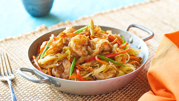 - Heat oil in large skillet on medium-high heat. Add carrots and pepper; stir-fry 1 minute. Add shrimp; stir-fry 2 minutes. Stir in sauce mixture and bring to boil. Add squash noodles, stirring gently to coat; cook 1 minute until heated through. Remove from heat. Sprinkle with green onions before serving.