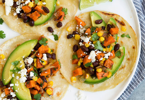 - Reduce heat to medium-low, add in drained black beans, corn, honey and lime juice. Heat until warmed through. Toss in roasted sweet potatoes and cilantro. Serve over warm tortillas with desired toppings.