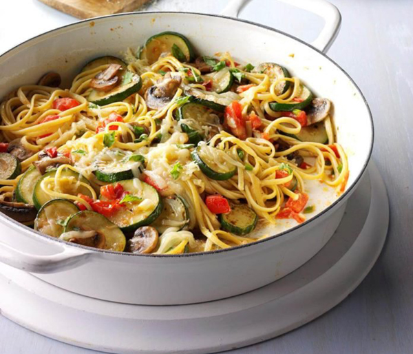 Cook linguine according to package directions. Meanwhile, in a large skillet, heat butter and oil over medium heat. Add zucchini and mushrooms; saute 3-5 minutes. Add tomato, onions, garlic and seasonings. Reduce heat; simmer, covered, about 3 minutes. Drain linguine; add to vegetable mixture. Sprinkle with cheeses and basil. Toss to coat.