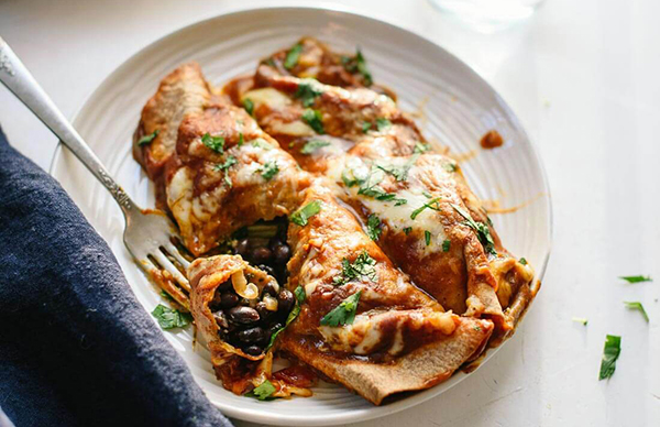 - Assemble the enchiladas: Pour 1/4 cup enchilada sauce into your prepared pan and tilt it from side to side until the bottom of the pan is evenly coated. To assemble your first enchilada, spread ½ cup filling mixture down the middle of a tortilla, then snugly wrap the left side over and then the right, to make a wrap. Place it seam side down against the edge of your pan. Repeat with remaining tortillas and filling.
