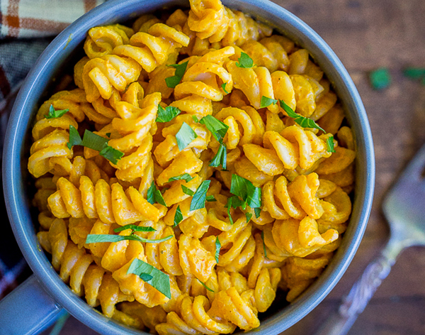 - While pasta is cooking, add all remaining ingredients to a high powered blender and blend for 1 minute, or until smooth.