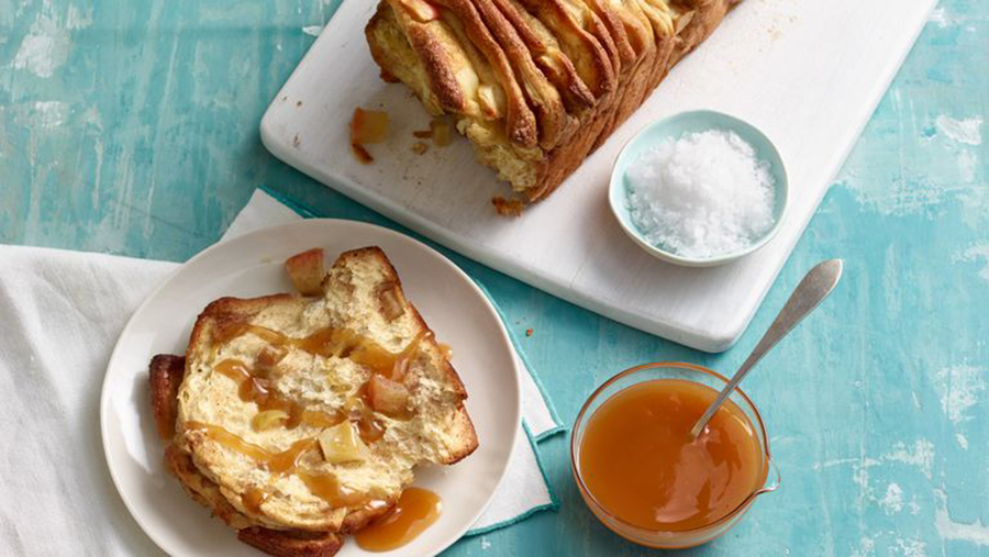 - Core and cut the apple into 1/4-inch pieces. Cut the dough crosswise into 6 even strips. Sprinkle 1 strip with some of the apples, gently pressing them into the dough. Top with another strip of dough and more apples; repeat with the remaining strips of dough and apples. Cut the stack into 6 equal portions. Stand the prepared loaf pan on one of its short sides, and arrange the stacks with cut sides facing out (tucking in any fallen apples). Cover and let rise for 20 minutes.