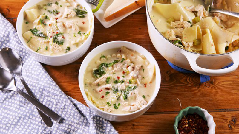 - Add butter and stir until melted. Stir in flour and cook until no longer raw, 2 to 3 minutes. Add broth and chicken and bring up to a simmer. Add noodles and cook until chicken is tender and noodles are cooked through, 12 to 14 minutes. Remove chicken and shred, then return to pot.