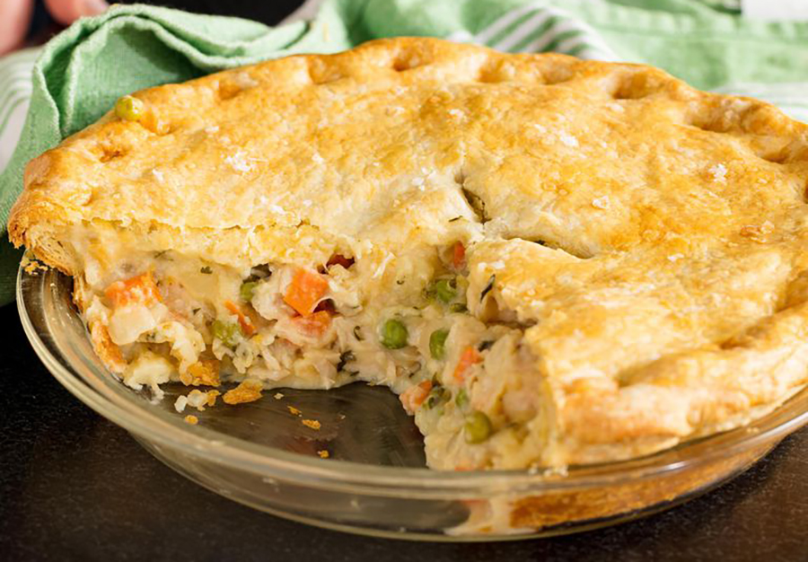 - Meanwhile, start filling: In a large pot over medium heat, melt butter. Add onions and carrots and cook until vegetables are beginning to soften, about 10 minutes. Stir in garlic, then stir in flour and cook until the flour mixture is golden and beginning to bubble. Gradually whisk in chicken broth. Bring mixture to a boil and cook until thickened, about 5 minutes. Stir in heavy cream, cubed chicken, peas, parsley and thyme. Season mixture with salt and pepper.