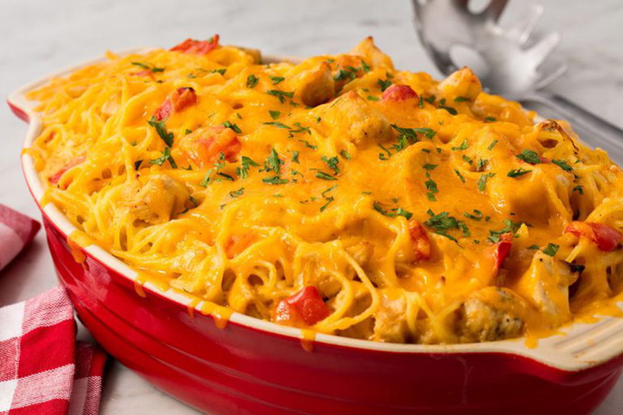 - Stir in spaghetti, 11⁄2 cups cheddar, and chicken. Transfer to a baking dish and top with remaining cup cheese. Bake until bubbly, about 45 minutes.