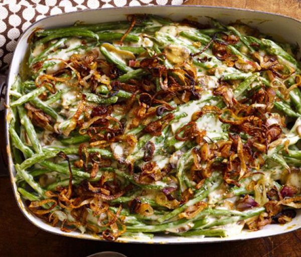 - Coat a 2-quart baking dish with cooking spray. Spoon the green bean mixture into the prepared dish and sprinkle the top with the crispy shallots and the remaining 2 tablespoons cheese. Bake until golden on top and bubbling, about 20 minutes.