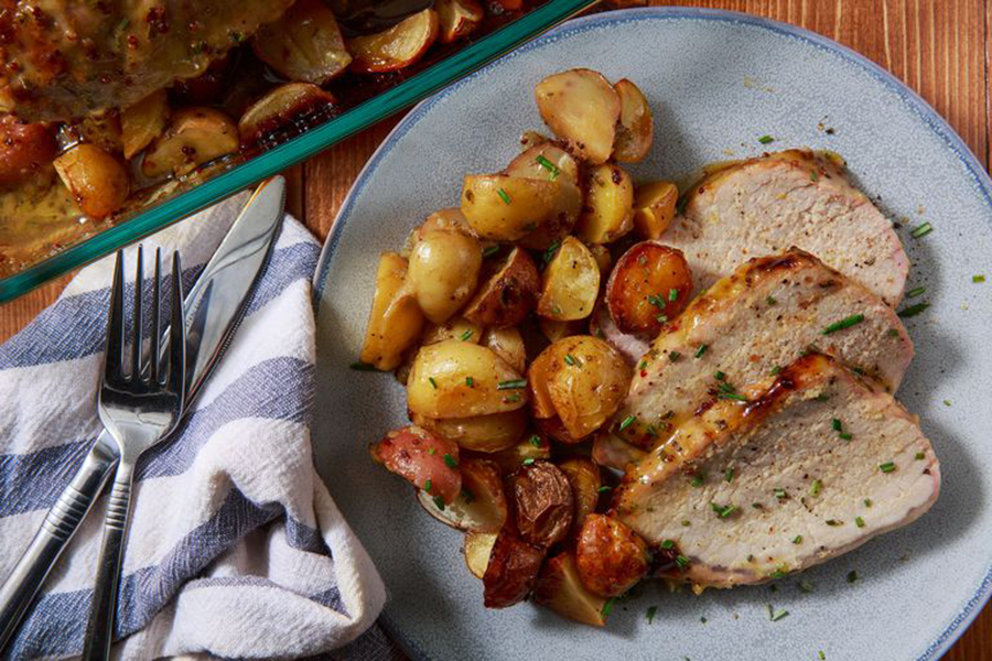- Preheat oven to 400°. Season tenderloin on both sides with salt and pepper. Place potatoes in a 9”-x-13” baking dish and drizzle with 2 tablespoons oil and season with salt and pepper. Place tenderloin on top.