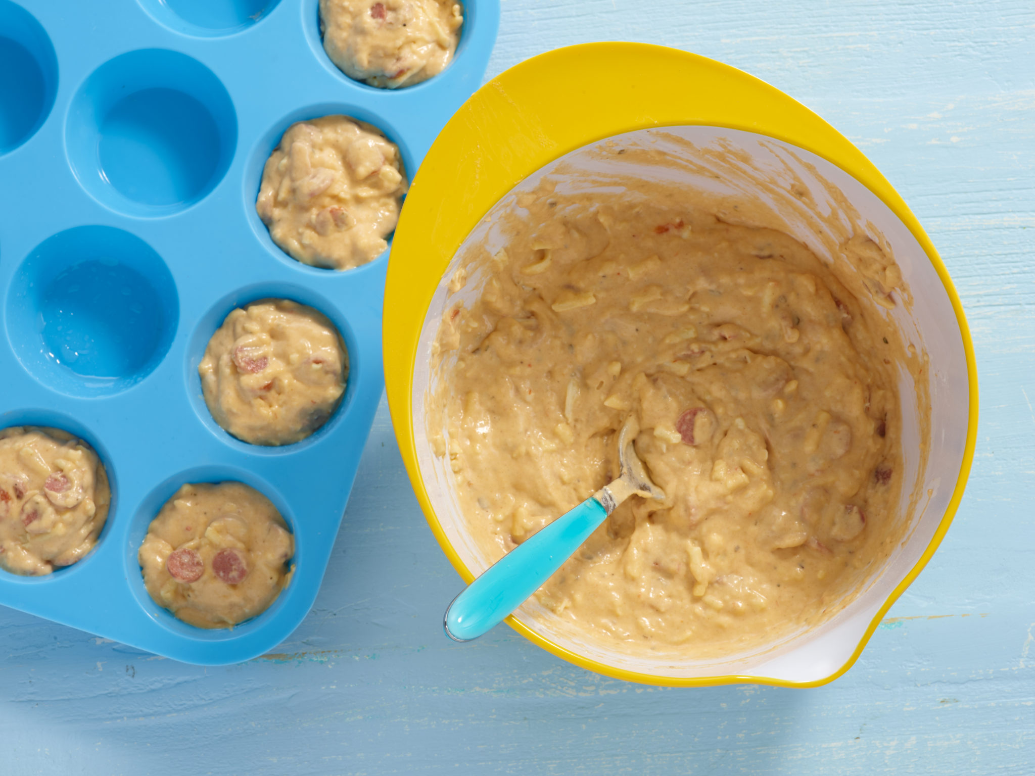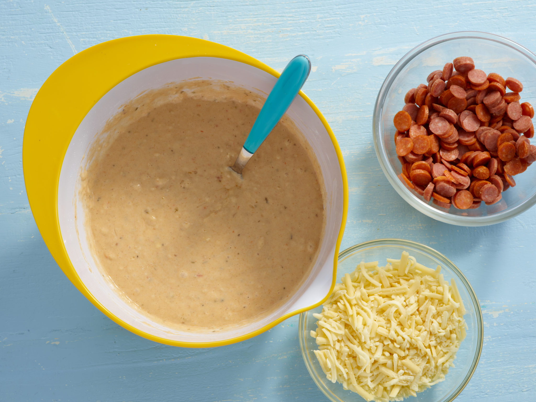 3. Pour the egg mixture into the flour mixture and lightly stir together. Then, fold in the cheese and pepperoni.