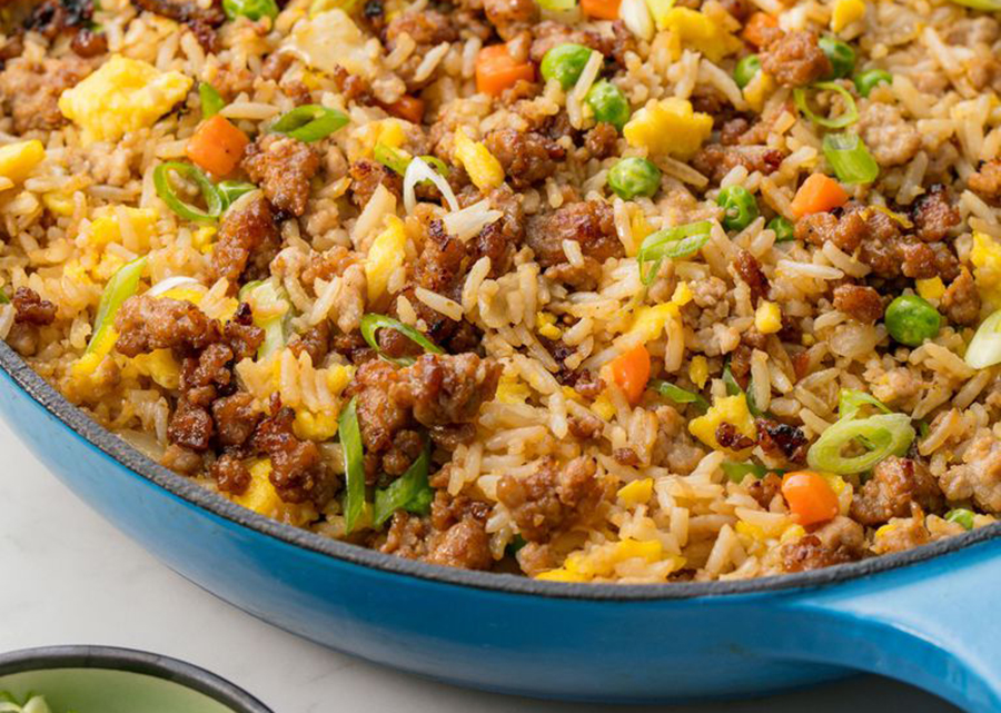 - Add the rice then stir in the soy sauce, hoisin, green onions, and sesame oil. Toss to combine then fold in scrambled eggs. Serve immediately.