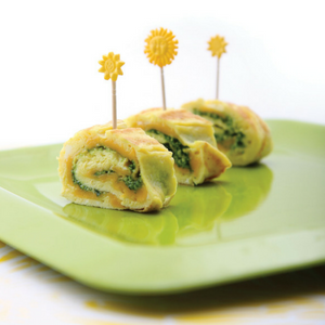 7. Stick a decorative toothpick into each egg roll-up. Eggs-tra helpings, please!