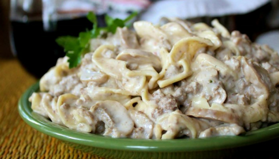 - Mix brown gravy, cream cheese, and mushrooms with hamburger, stirring until cream cheese melts. Add milk, sour cream, and mushroom soup to cooked pasta. Blend hamburger mixture with pasta.