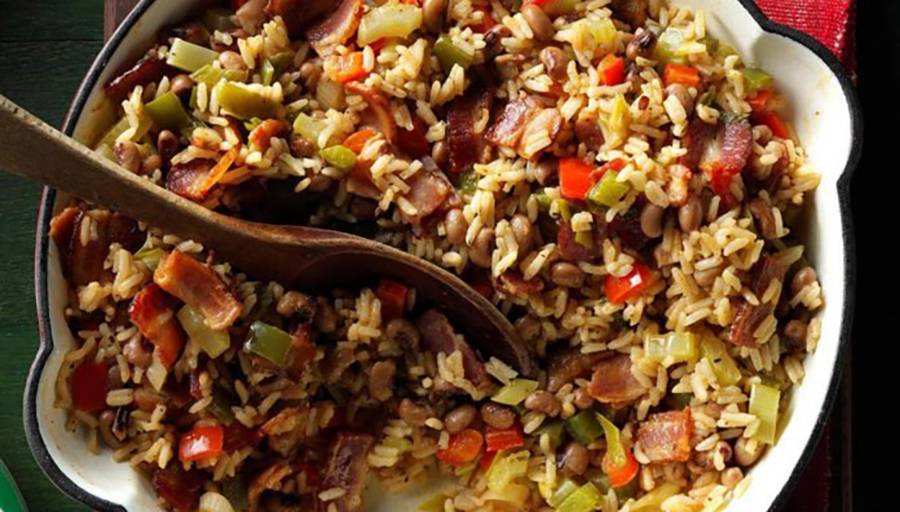 - In a large skillet, cook bacon over medium heat until crisp. Drain on paper towels; discard all but 2 tablespoons drippings. Saute pepper, celery and onions in drippings until almost tender. Add rice, water and seasonings. Cover and simmer 10 minutes. Add peas and bacon; simmer 10 minutes longer. Discard bay leaf.