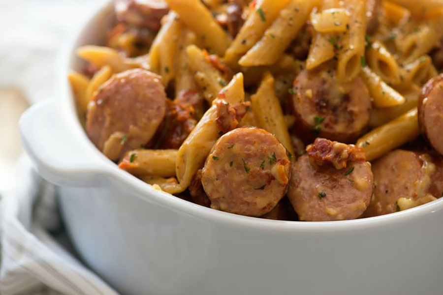 - Slice sausage into 1/4″ thick rounds, then set aside. In a deep, 12″ skillet over medium heat, heat oil. Add onions and sausage and cook, stirring often, 5 minutes. Add garlic and cook one minute more, stirring constantly. Add sun-dried tomatoes, penne, chicken broth, and half-and-half and turn heat to high.