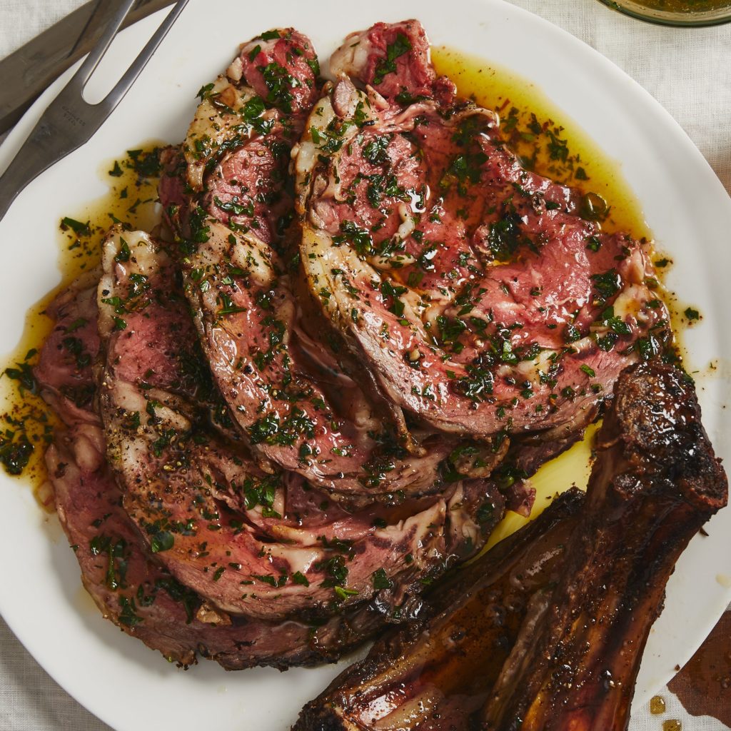 This rib roast is rubbed with a punchy mixture of rosemary, anchovies, and garlic. The reverse sear (starting low and slow, finishing hot and fast!) is excellent when cooking large cuts of meat for a crowd, not only for its foolproof results, but because it’s the ultimate do-ahead. Slow-roast it up to two hours before guests arrive, then finish in a hot oven at the last minute. This is the stunning main course from Alison Roman’s “Steak House Night in America” menu.
