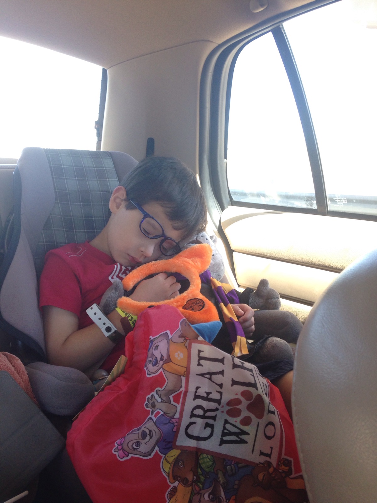 The big family hit was the MagiQuest. This was, hands down, our favorite attraction and well worth the extra cash, for sure. Step one in this game is to buy your wand and choose your Magi name. One thing to remember is that your wand is also a souvenir that goes home with you. Keep it, and when you return the ANY Great Wolf Lodge property, you can bring it with you and continue your quest. With wand in hand, you will follow the clues provided to you in the Ancient Book of Wisdom. Secretly, I think MagiQuest is Great Wolf Lodge’s covert way of getting its guest to exercise, as the “quest” takes you up and down the “hidden” stairwells. Seriously, guests of all ages were climbing up and down the stairs and moving through certain parts of the hallways and special rooms, waving wands and solving riddles and clues. Once we started, we were hooked and can’t wait to return to continue on our quest to slay the dragon and be knighted a Master Magi. My husband and I both agree that the smiles and fun this activity provided made up for any extra expense.The ride home saw an exhausted 5-year-old sleeping in the backseat, no doubt dreaming of our next visit to Great Wolf Lodge.