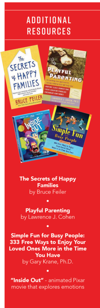Experts agree, families who play together tend to be happier and more deeply connected. Whether you throw the football, compete in a game of cards, dance to funky music in your living room, or make up games on a car ride, play will strengthen your relationship with each other.