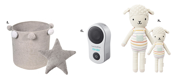 This adorable tasseled basket is handmade and great for storing books, blankets, toys, or stuffed animals. Available in 11 colors. Another perfect addition to any nursery is Lorena Canals Star Pillow that’s machine washable! $49 – $59 • lorenacanals.us