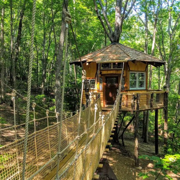 Step into another world as you cross the 70-foot suspension bridge into the floating house in the trees.