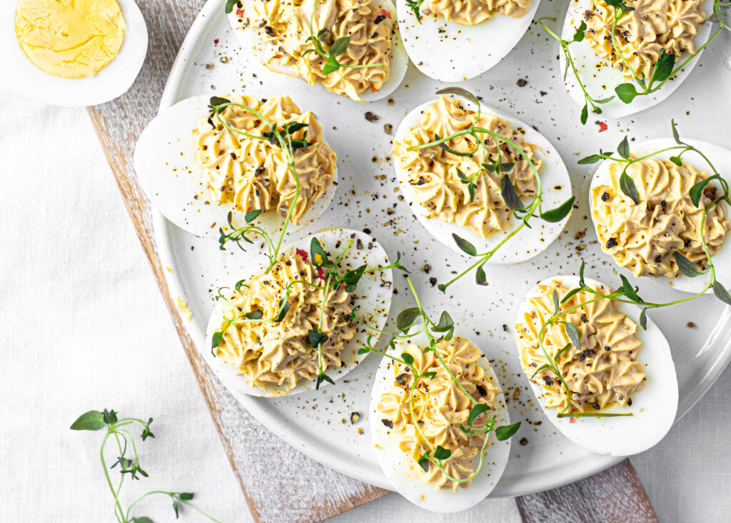 - Arrange the egg white halves on a platter and set aside.