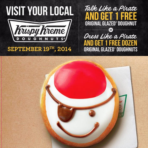 Friday, September 19, any buccaneer to enter a participating Krispy Kreme and talk like a pirate gets one FREE Original GlazedĀ® doughnut. To the landlubber who dares to wear full pirate attire goes a bounty of one FREE dozen Original Glazed doughnuts.